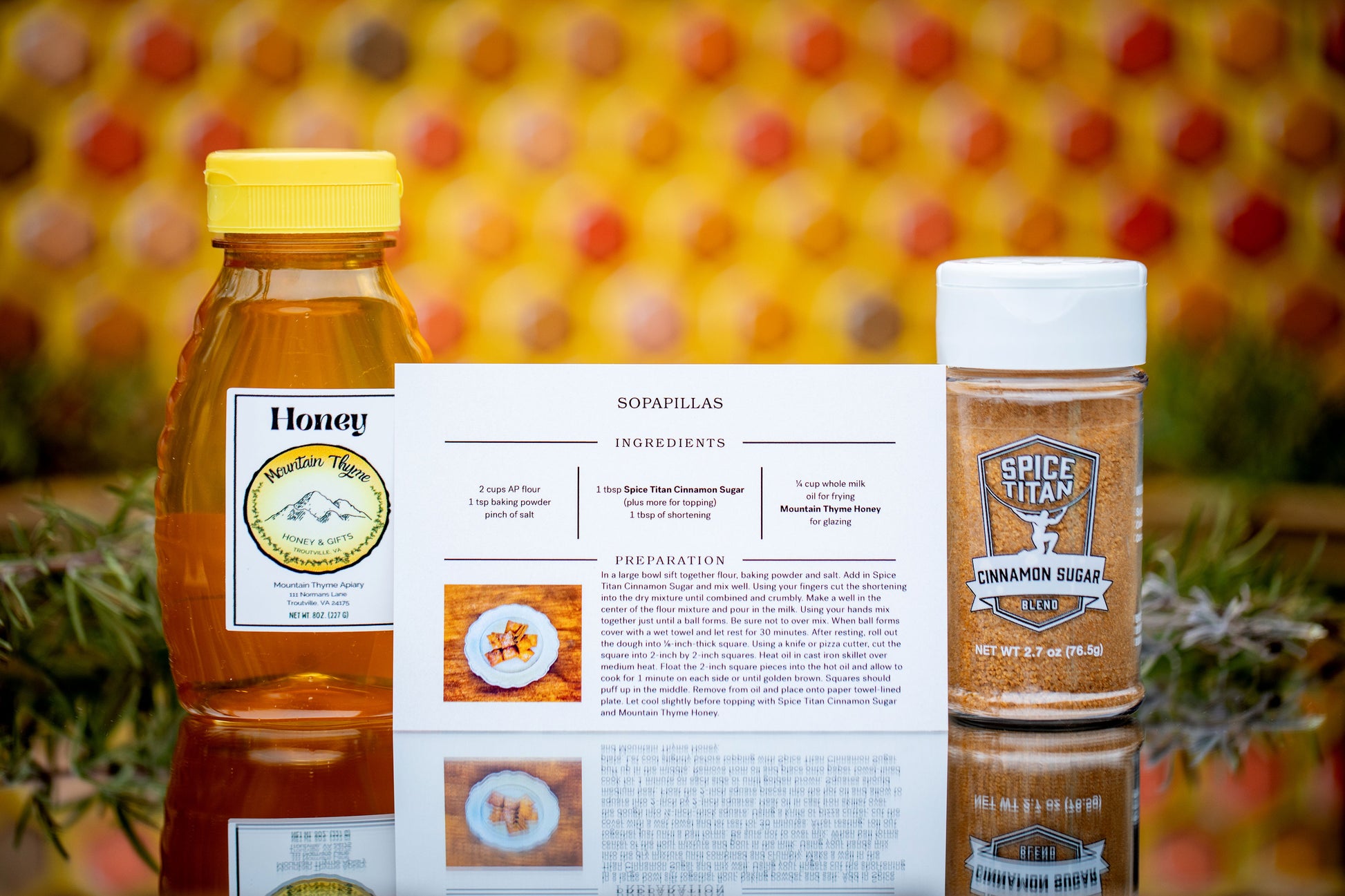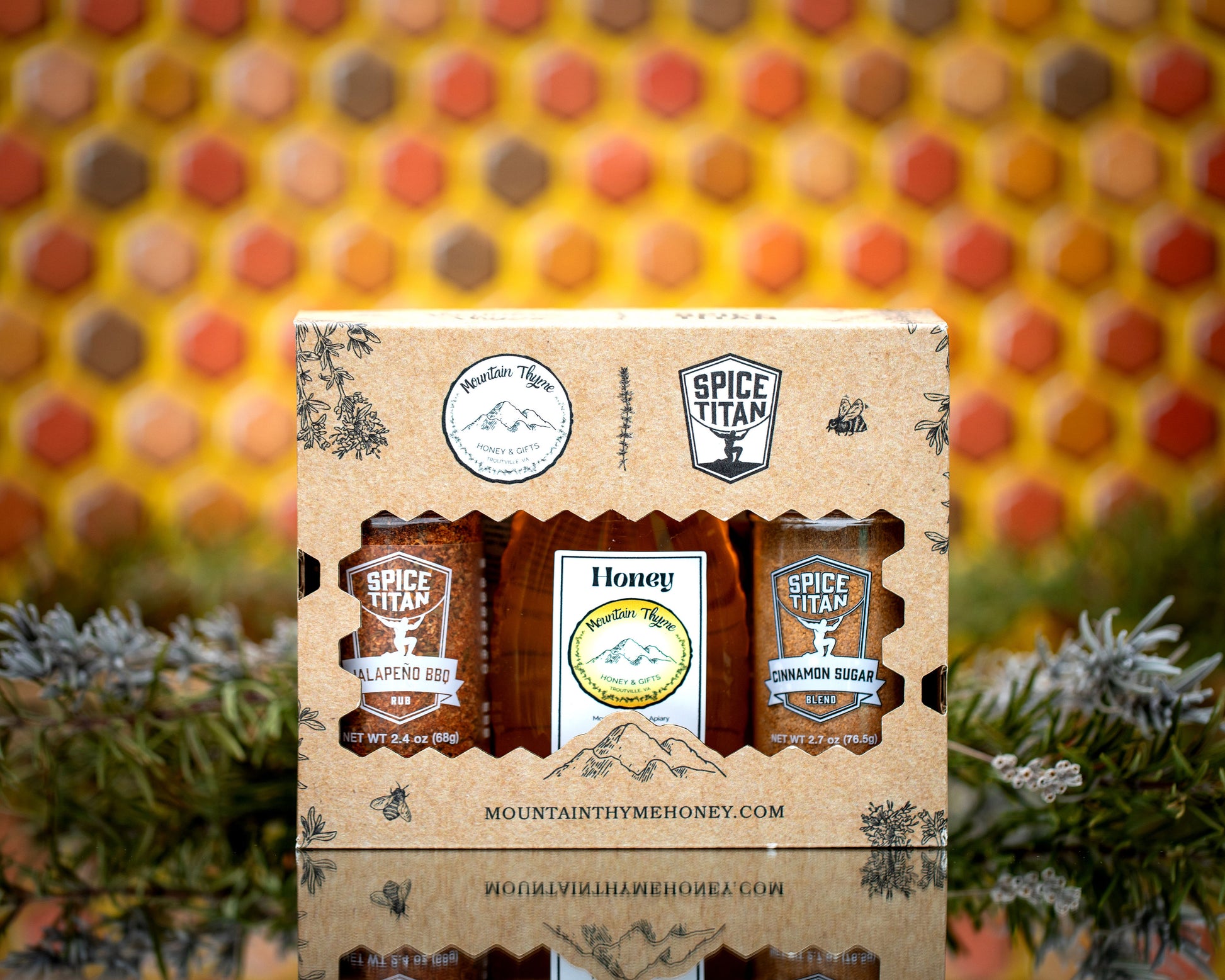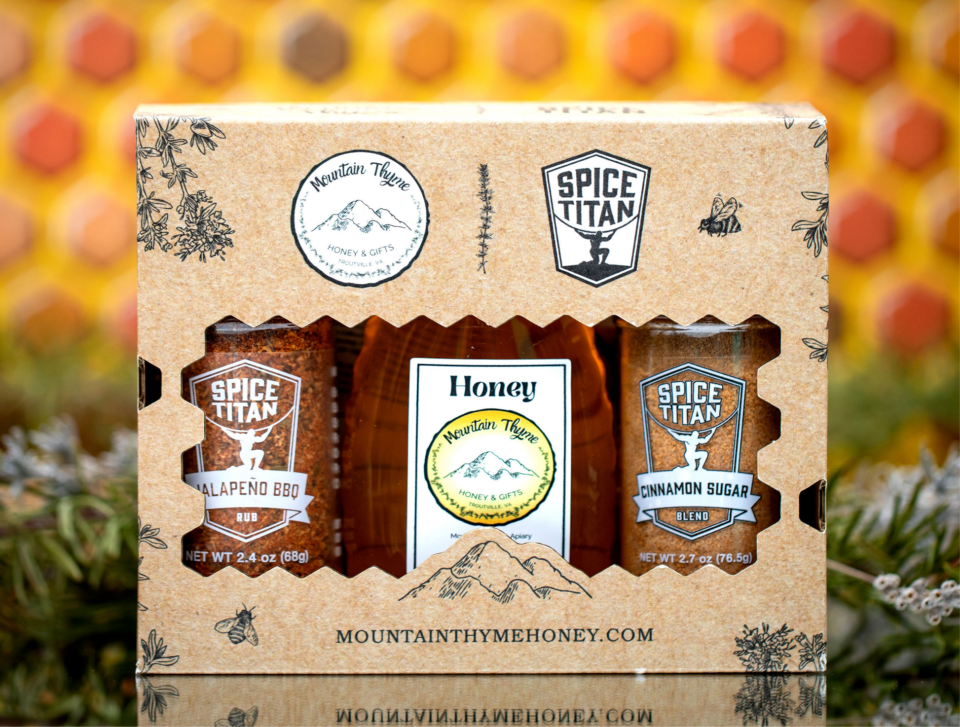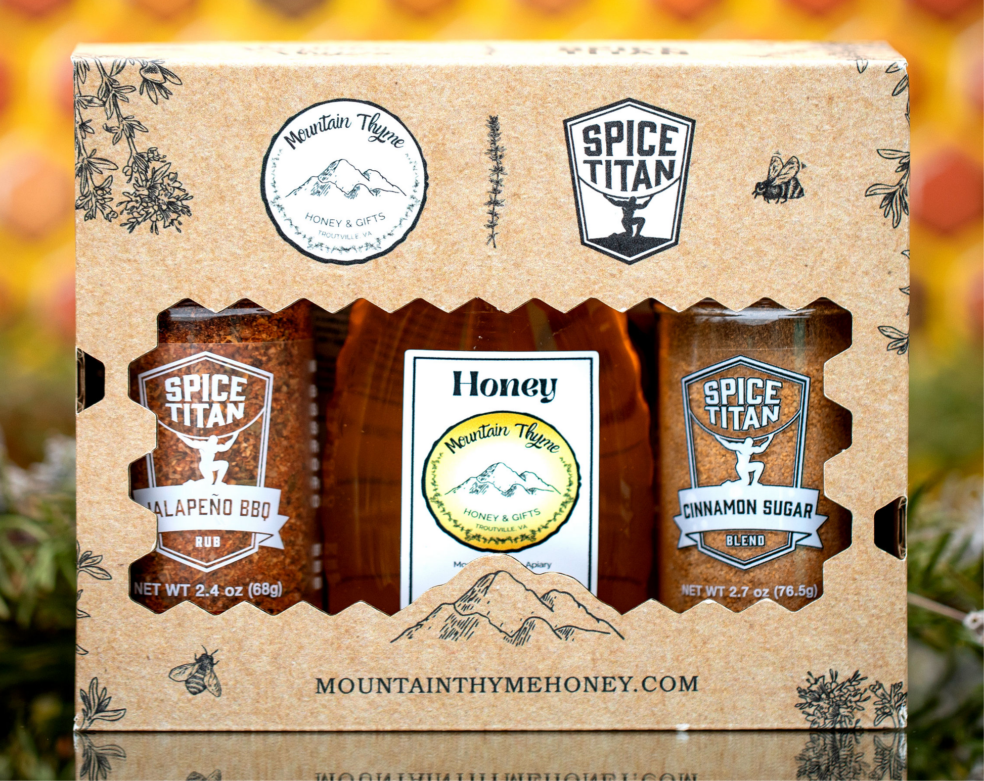 Inside our custom-made box, you'll find a bottle of rich, golden honey from Mountain Thyme, perfectly complemented by two signature spice blends: the zesty Jalapeño BBQ and the sweet and aromatic Cinnamon Sugar. Each ingredient is thoughtfully selected to enhance your dishes and bring a touch of gourmet flair to your kitchen.